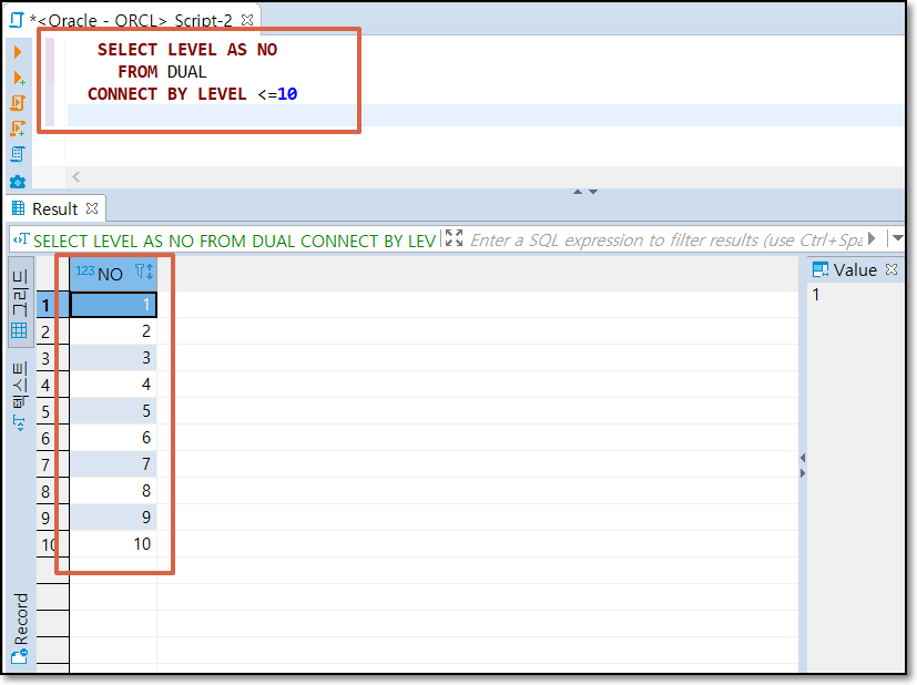 1~10까지 연속된 숫자 조회