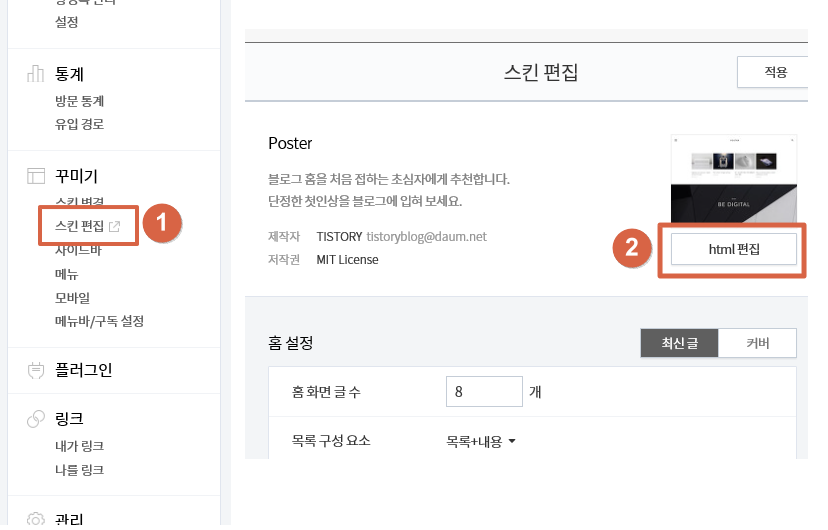 1-1. Tistory 블로그관리 > 꾸미기 > 스킨편집 > Html 편집 > CSS 탭 열기