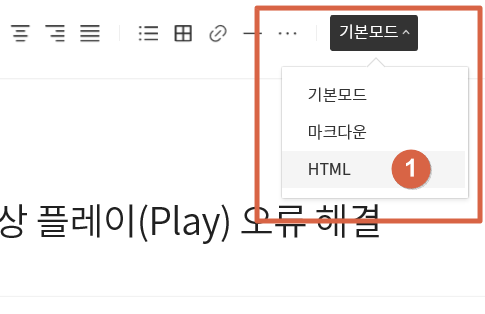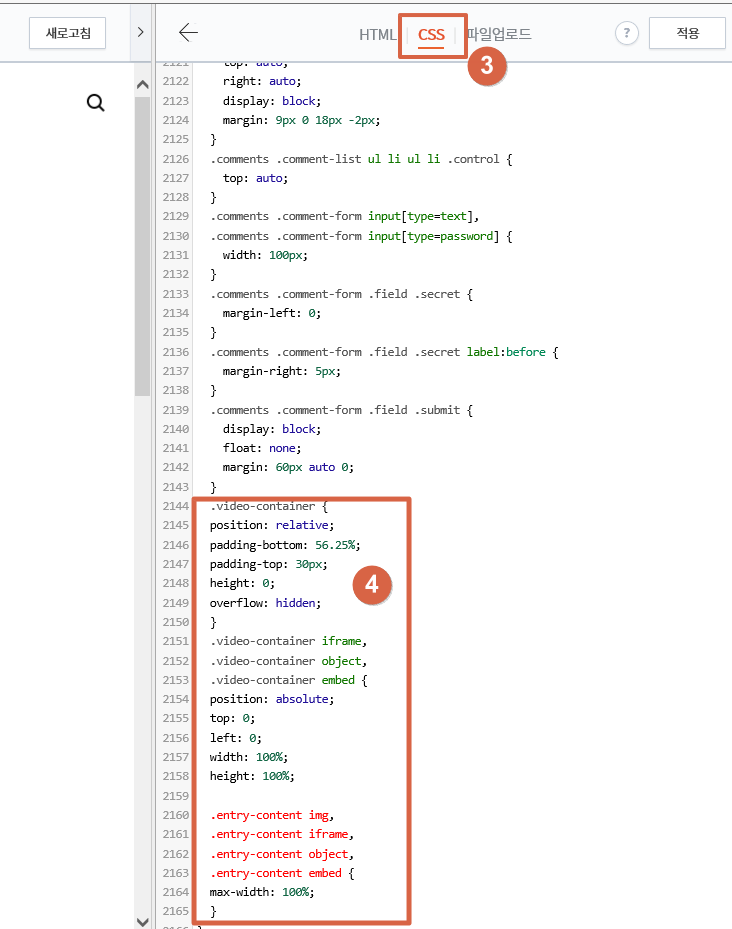 문제 해결을 위하여 검색을 해보니 티스토리 관리 화면에 동영상 재생을 위한 CSS 코드를 추가하고