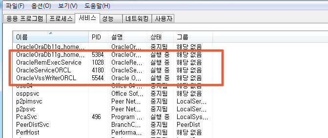 Ctrl+Alt+Del 키 --> 작업관리자 --> 서비스--> OracleXXXX 서비스 실행 확인