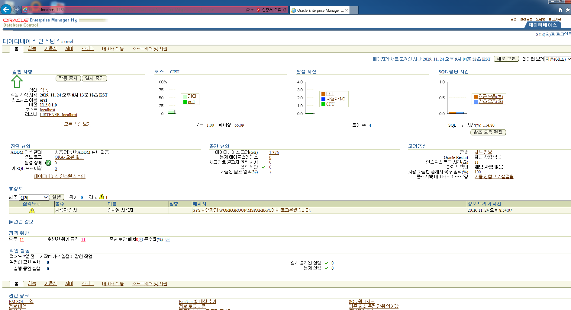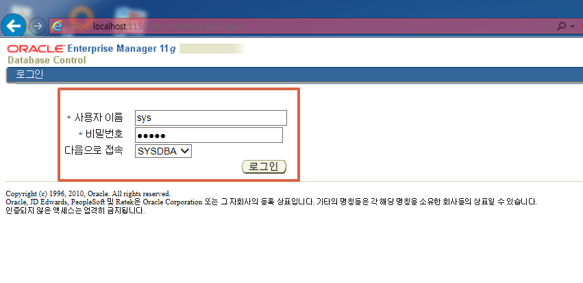 http://localhost:1158/em 접속 --> 사용자 로그인