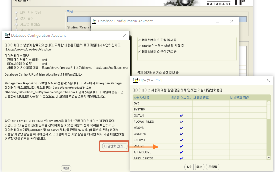 - 관리자(SYS,SYSDBA) 비밀번호 : 데이터베이스 관리 Super 유저(SYS, SYSDBA) 비밀번호