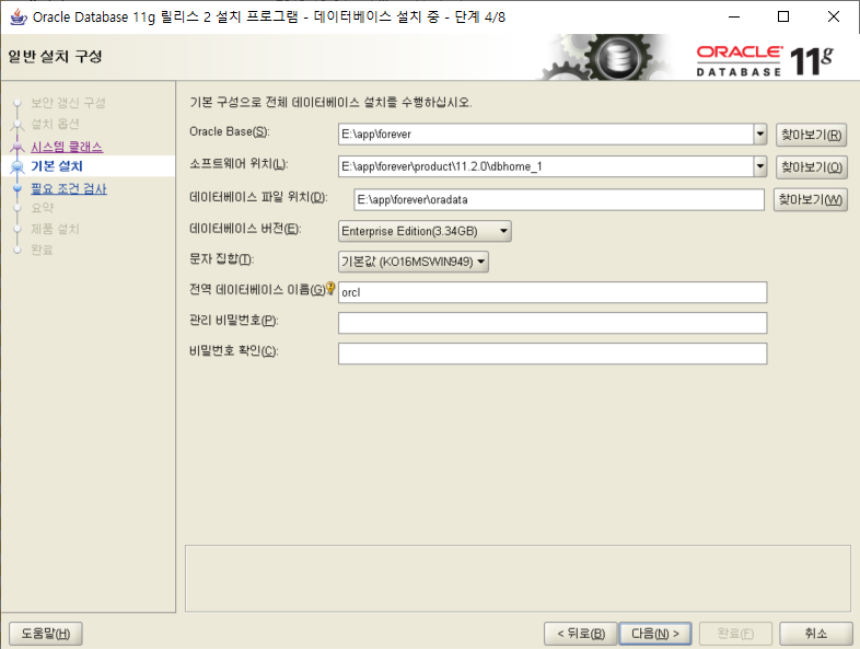 - 데이터베이스 버전 : Enterprise, Standard, Client 등 기능별로 버전을 선택할 수 있으며 버전에 따라 기능과 설치 공간이 상이함. 나중에 추가 설치 없이 오라클 모든 기능을 익히기 위해 Enterprise 버전 선택