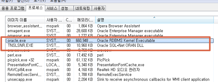 Ctrl+Alt+Del 키 --> 작업 관리자 --> 프로세스--> oracle.exe, TNSLSNR.EXE 실행 확인