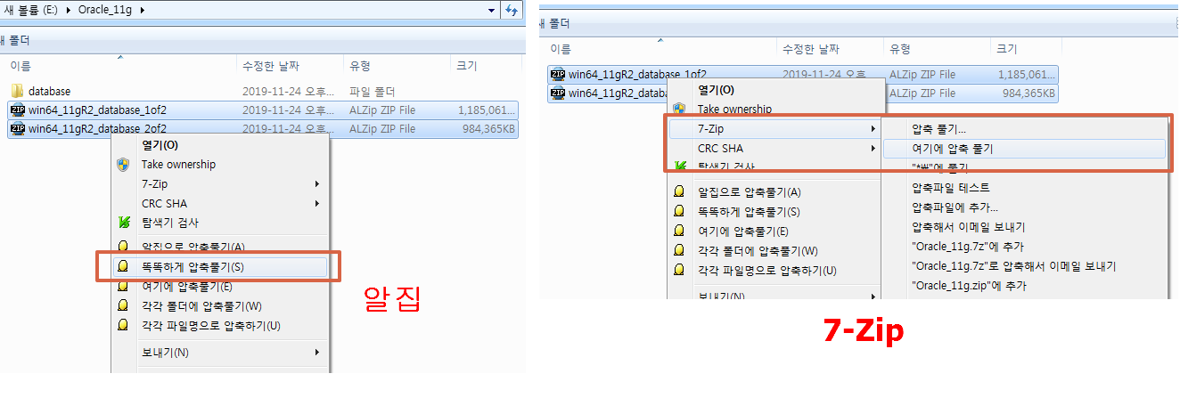 알집은 '똑똑하게 압축 풀기', 7-zip은 '여기에 압축 풀기' 옵션으로 실행하면 database 폴더가 생성되고 설치 파일들이 압축 해제됩니다.