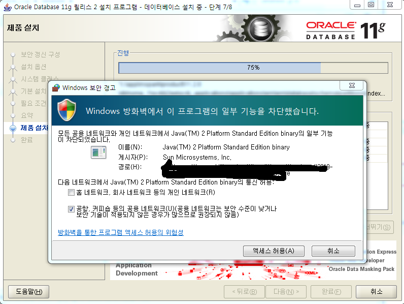 2-7. 설치 중간 Windows Java 접속 관련 방화벽 경고 '액세스 허용' 누르고 진행