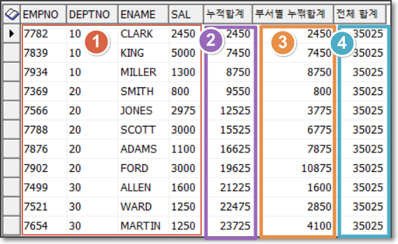 ③ 부서 기준 급여 누적 => SUM(SAL) OVER(PARTITION BY DEPTNO ORDER BY EMPNO)