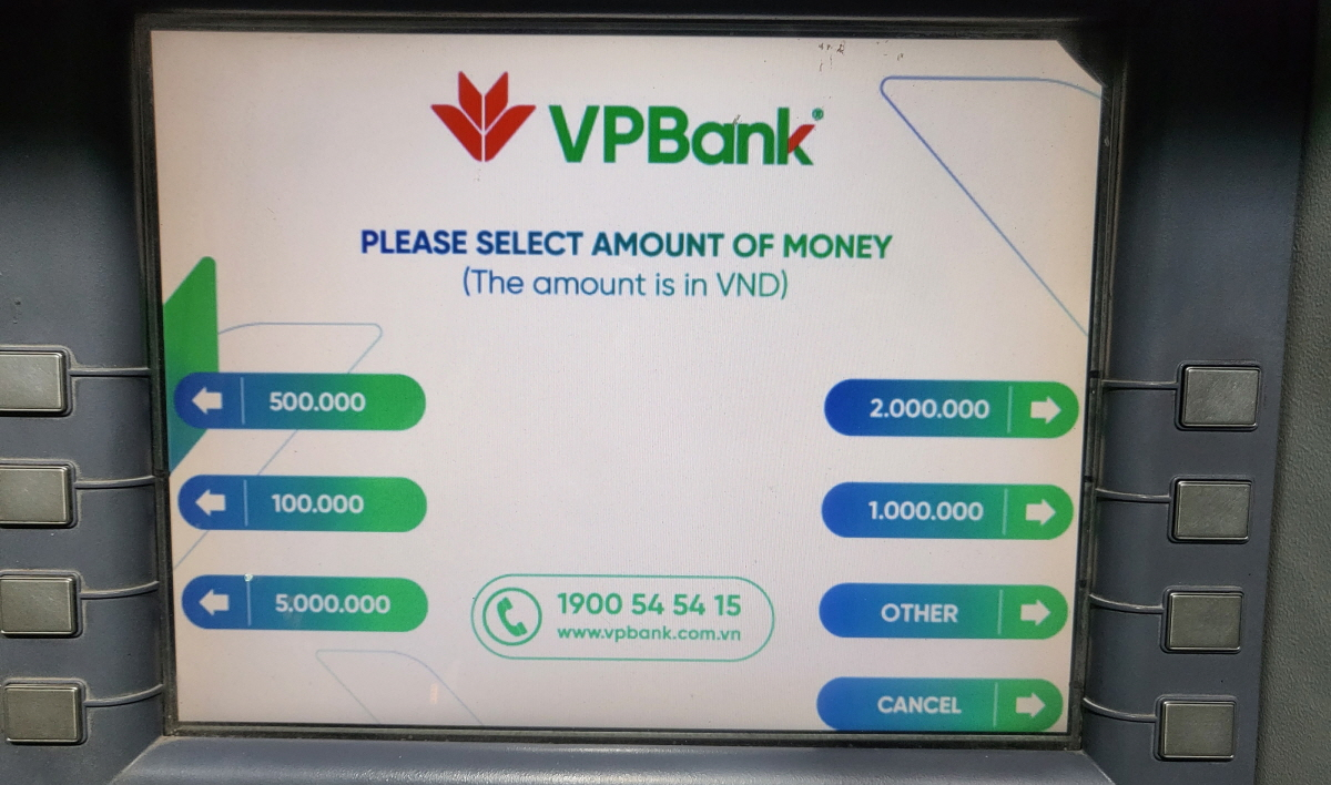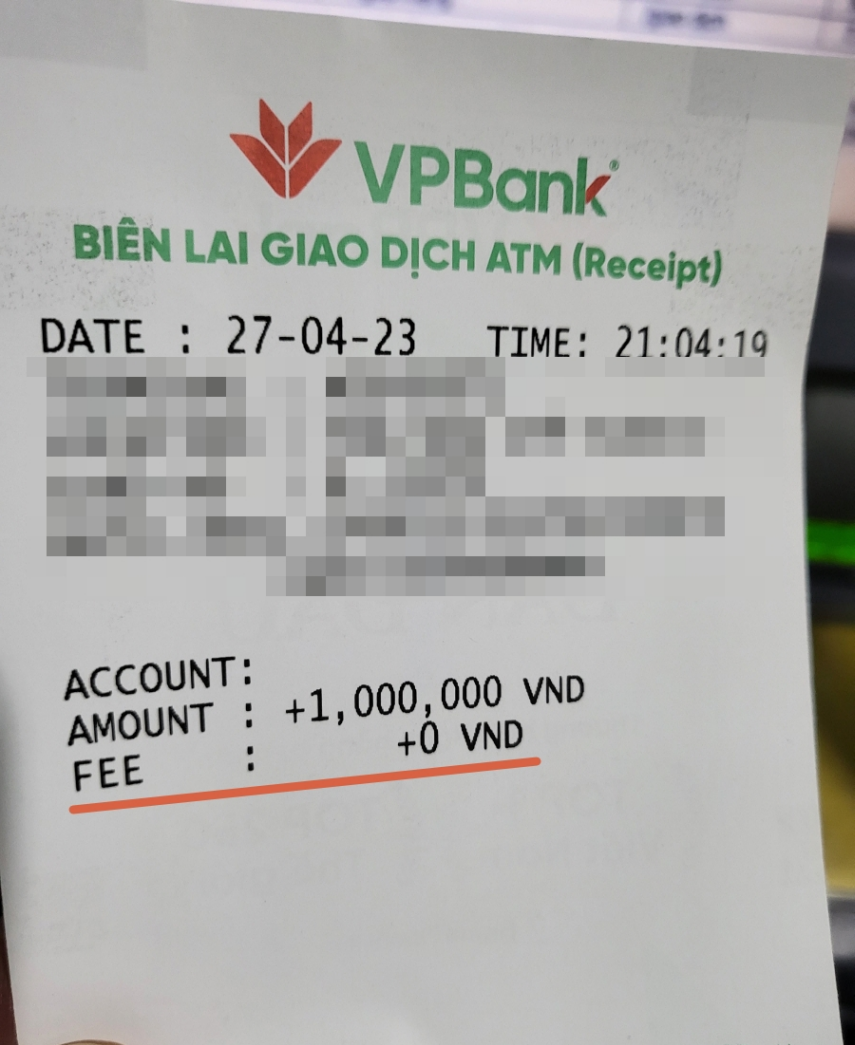 글을 작성하는 23년 4월 기준으로 베트남 VP Bank에서 인출 시 ATM기 사용 수수료(FEE)가 무료입니다. 타 은행 ATM기는 한번 인출할 때마다 금액과 상관없는 평균 5만동(한화 약 2700원 정도) 수수료(FEE)가 추가됩니다.