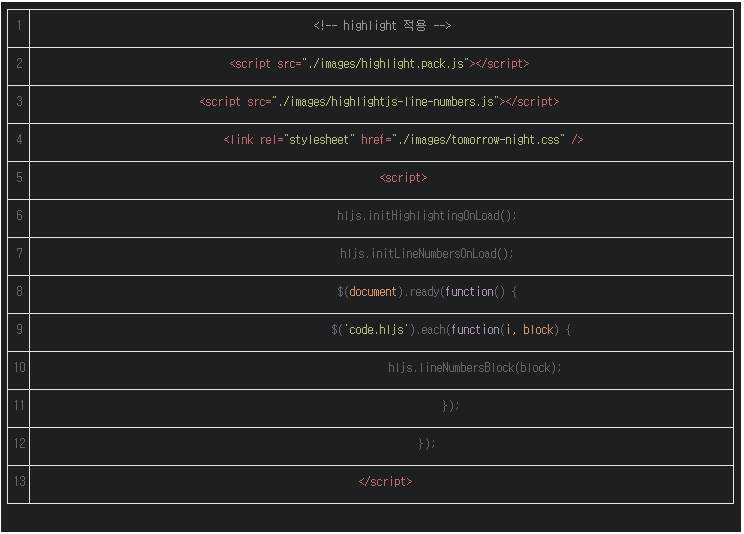 하지만 라인번호(Line Number)가 없어 아쉬움이 있었는데 highlightjs-line-numbers.js를 적용하시면 라인번호도 출력이 됩니다.