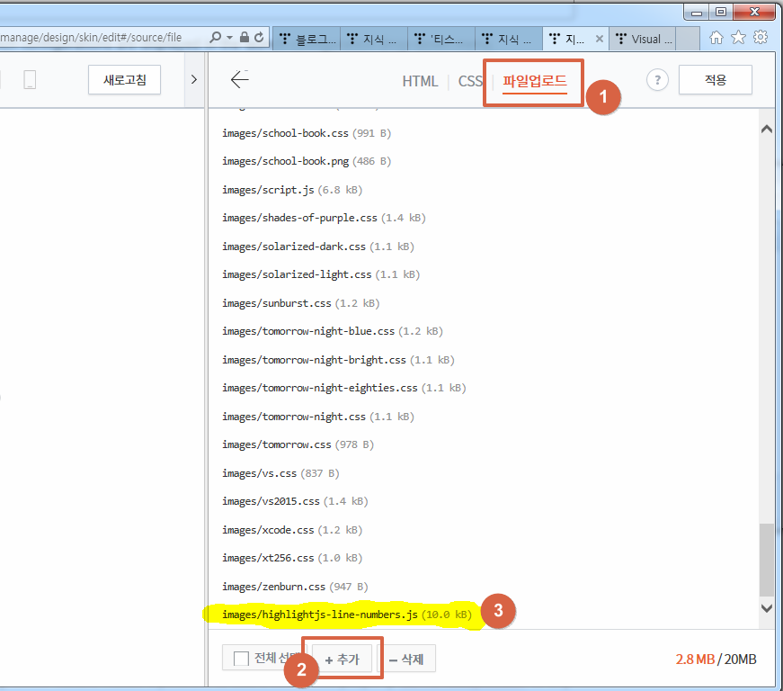 ▼ 티스토리 관리자 페이지에 highlightjs-line-numbers.js 업로드