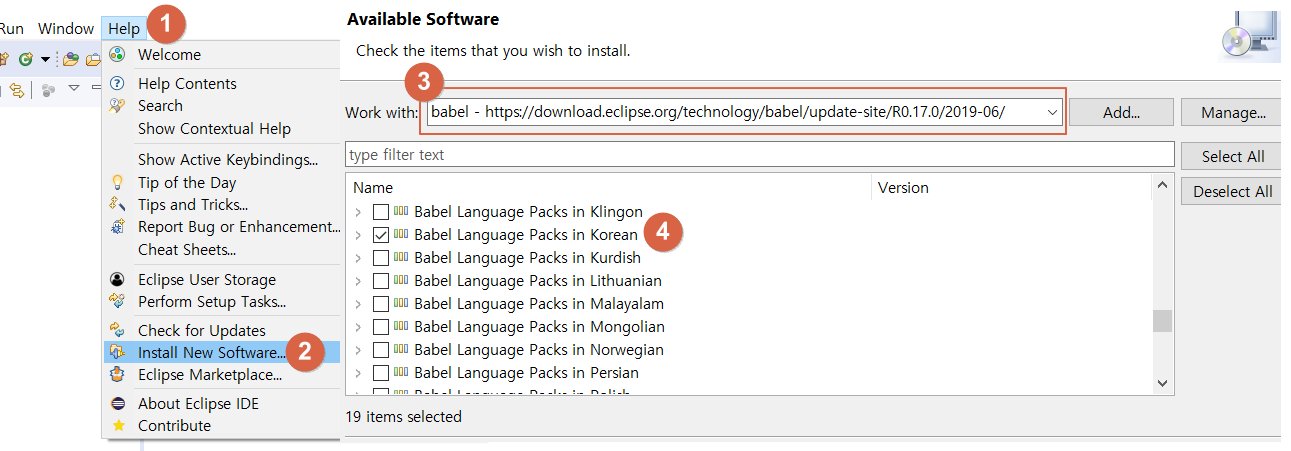 * Babel Language Pack Update Site for 20XX-XX 주소를 복사 합니다.